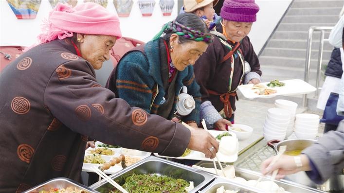 首批入住的農(nóng)牧民正在打飯。圖由董治剛提供