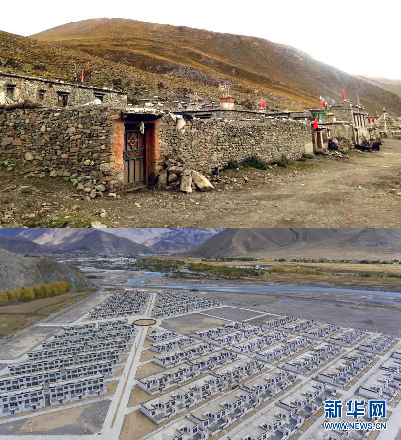 拼版照片:上圖是曾經的西藏日喀則市拉孜縣查務鄉(xiāng)民房(資料照片);下圖是西藏日喀則市南木林縣孔阿村易地搬遷點(2018年9月28日南木加攝,無人機照片 )新華社發(fā)