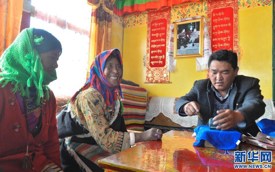 西藏日喀則市薩嘎縣達吉嶺鄉(xiāng)薩嘎村牧民在助農(nóng)取款服務點刷卡取款(2014年4月27日攝)。新華社記者 普布扎西 攝