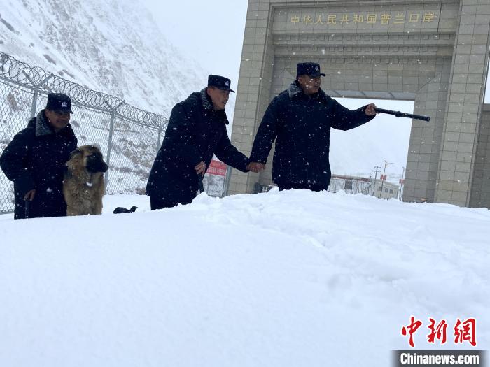 圖為在積雪中守衛(wèi)國門的普蘭邊檢站民警。 普蘭邊檢站供圖