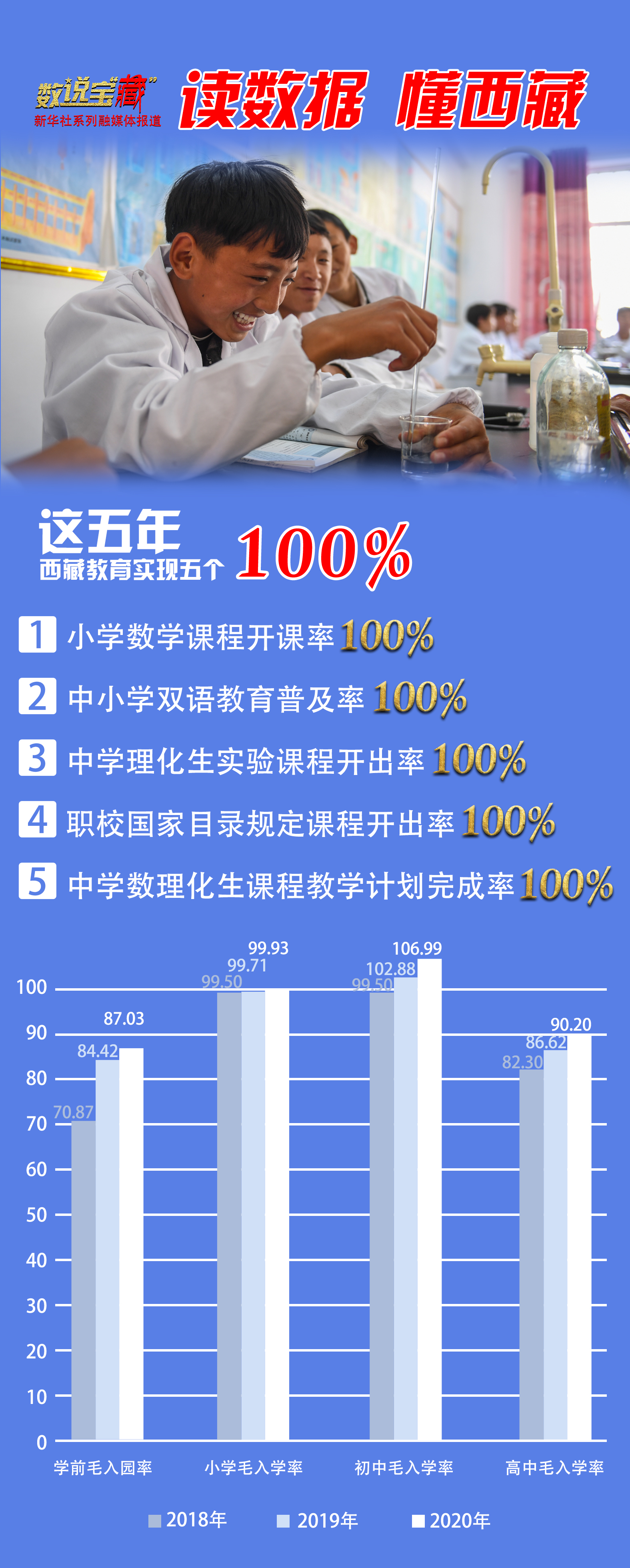 “五個100%”教育目標(biāo)是西藏基礎(chǔ)教育重點(diǎn)工程的主要內(nèi)容,于2016年正式確定。西藏在資金投入、教師培訓(xùn)、實驗設(shè)備和儀器配備等方面給予學(xué)校支持,并重點(diǎn)加強(qiáng)理科教學(xué)和實驗教學(xué),強(qiáng)化教師專業(yè)技能培訓(xùn)。對此,西藏先后投入2.12億元新建中小學(xué)實驗室60萬平方米,投入1.99億元采購中小學(xué)實驗教學(xué)儀器設(shè)備等。