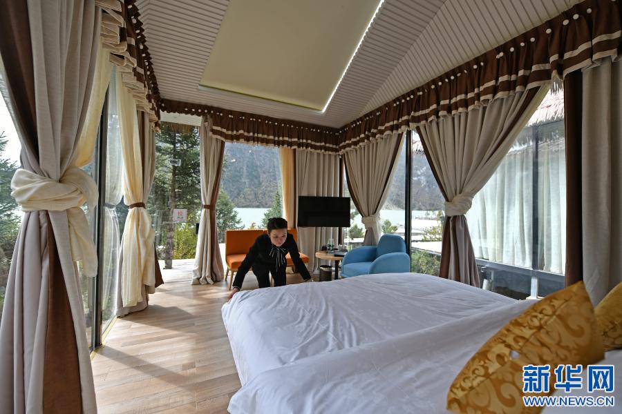 然烏國際自駕·房車露營營地是西藏昌都市八宿縣招商引資的旅游產(chǎn)業(yè)扶貧項目,2018年3月正式營業(yè)。圖為一名營地工作人員在湖邊的星空房內整理房間(2019年5月24日攝)。新華社記者 李鑫 攝