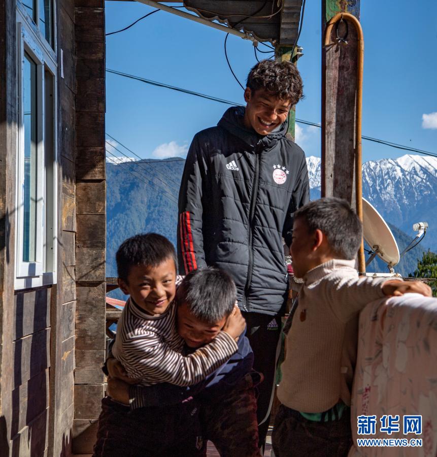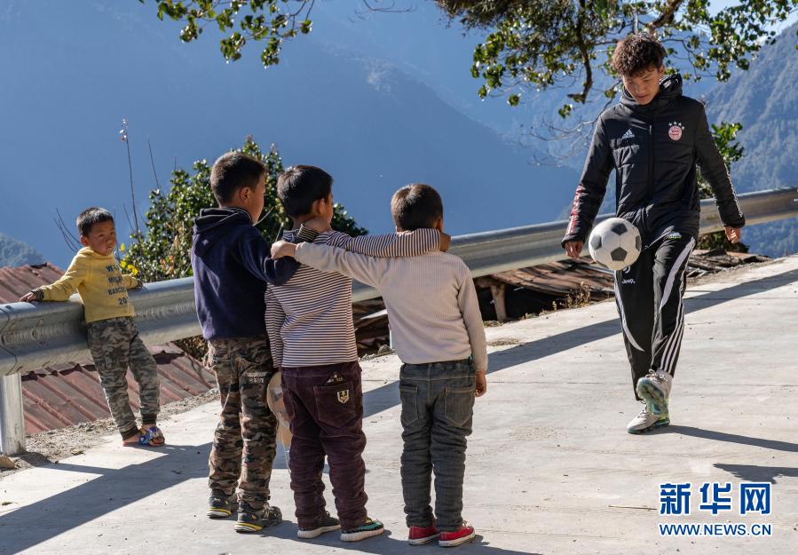 在西藏林芝市墨脫縣德興鄉(xiāng)巴登則村,旺前羅布向弟弟們展示自己的球技(2月9日攝)。新華社記者 孫非 攝