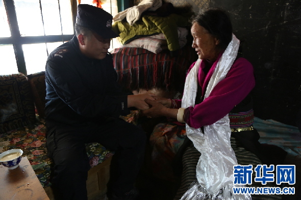 西藏出入境邊檢總站執(zhí)法調查支隊四隊民警在卓瑪老人家中慰問(3月4日攝)。新華網發(fā) 羅云川攝