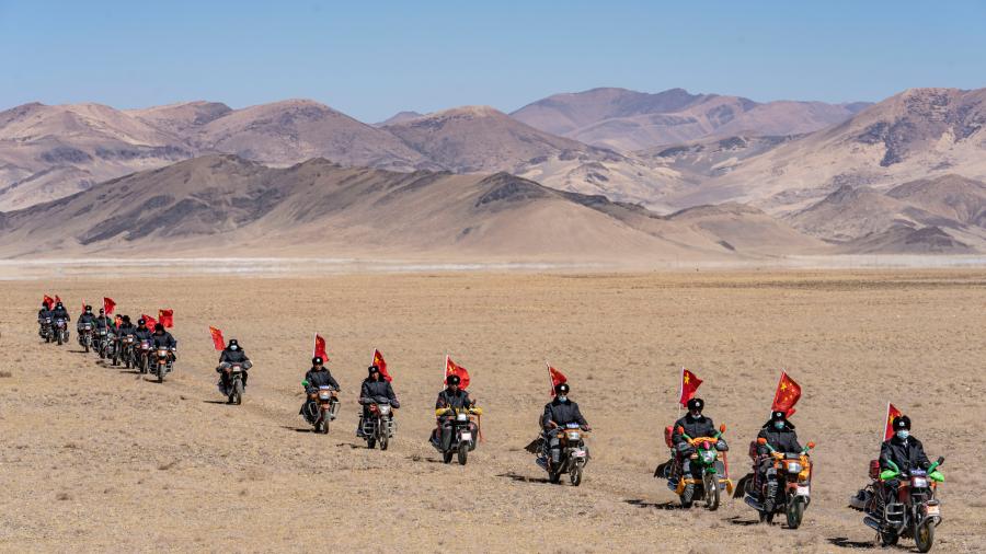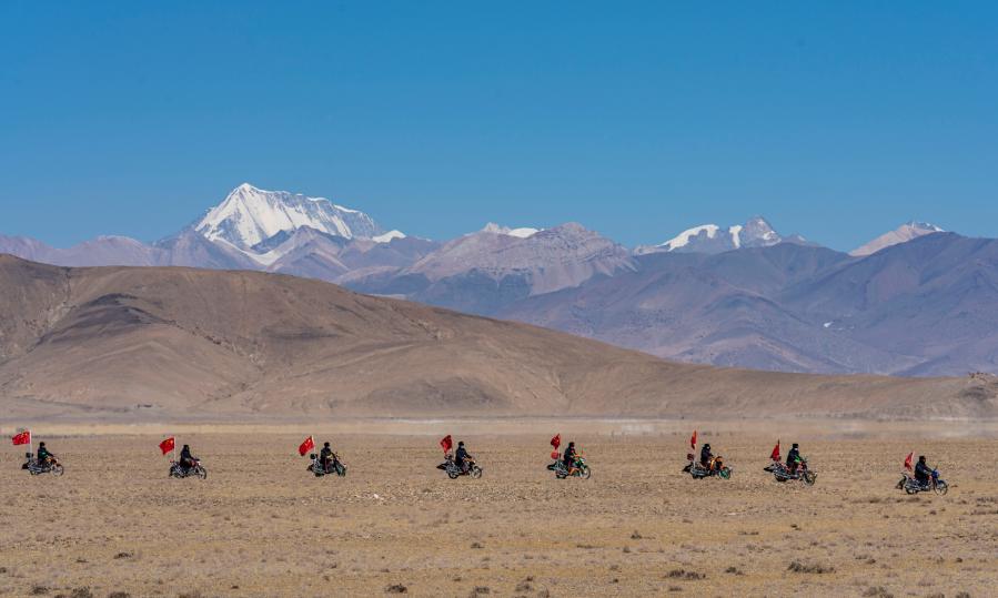 西藏日喀則市薩嘎縣昌果鄉(xiāng)的一處村莊里,48歲的藏族漢子石覺塔布在風中跨上一輛摩托車,向平坦無垠的高原邊緣騎去。他的車尾插著一面五星紅旗,被風吹得獵獵作響,即便駛出很遠,那抹紅色在車輪卷起的煙塵中也依然醒目。
