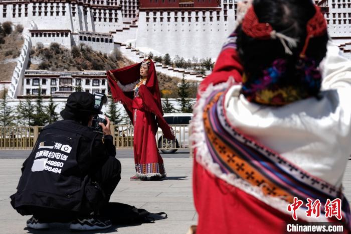 游客在拉薩布達(dá)拉宮廣場(chǎng)體驗(yàn)藏式元素服裝。江飛波 攝