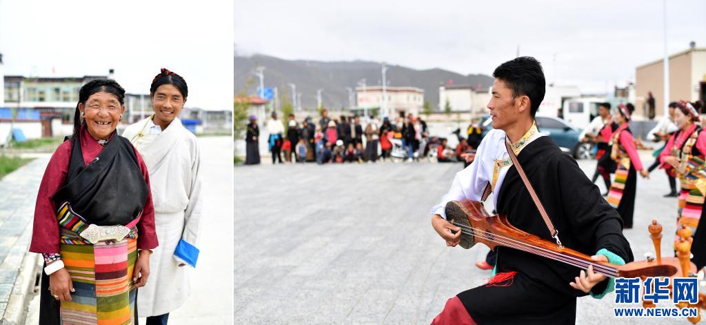 拼版照片:左圖為西藏日喀則市拉孜縣查務(wù)鄉(xiāng)明瑪村村民倉瓊(左)和兒子群培次仁;右圖為拉孜縣民間藝術(shù)團(tuán)在明瑪村易地搬遷點(diǎn)為村民表演(2020年8月2日攝)。新華社記者 詹彥 攝
