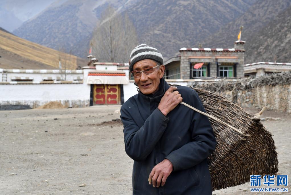 在拉薩市當(dāng)雄縣寧中鄉(xiāng)麥靈村,次仁老人背著籮筐出門(mén)取干牛糞(4月16日攝)。新華社記者 覺(jué)果 攝