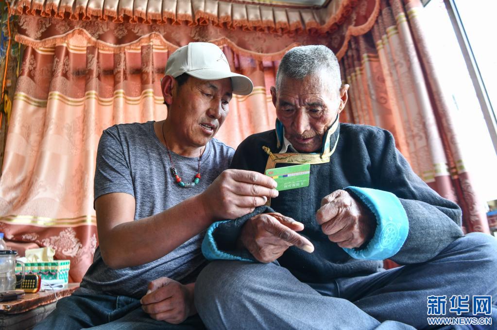 拉布的兒子(左)在向老人介紹醫(yī)保卡的情況(4月25日攝)。新華社記者 晉美多吉 攝