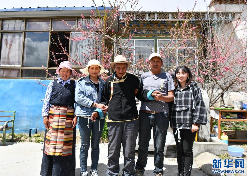拉布老人(中)在家里和家人合影(4月25日攝)。新華社記者 晉美多吉 攝