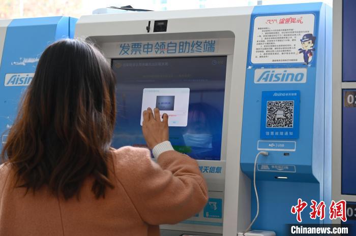 圖為一名企業(yè)財務(wù)人員通過發(fā)票申領(lǐng)自助終端申領(lǐng)發(fā)票。