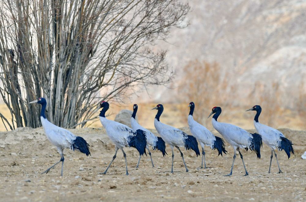 西藏日喀則市南木林縣艾瑪鄉(xiāng)田野里的黑頸鶴(2020年1月24日攝)。新華社記者 張汝鋒 攝