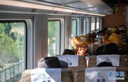 來自山南市貢嘎縣杰德秀鎮(zhèn)杰德秀村的巴珠,今年68歲,他一會兒從車窗眼望高山峽谷,一會兒摸摸車內(nèi)現(xiàn)代化設(shè)施,這是他頭一次坐火車?!皬?fù)興號和牛車比起來,像是在飛翔?!彼χf。