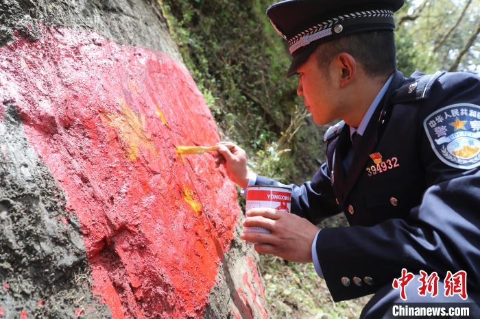 圖為玉麥邊境派出所移民管理警察在邊境一線對(duì)國旗、中國字樣等主權(quán)標(biāo)志物描紅。山南邊境管理支隊(duì)供圖