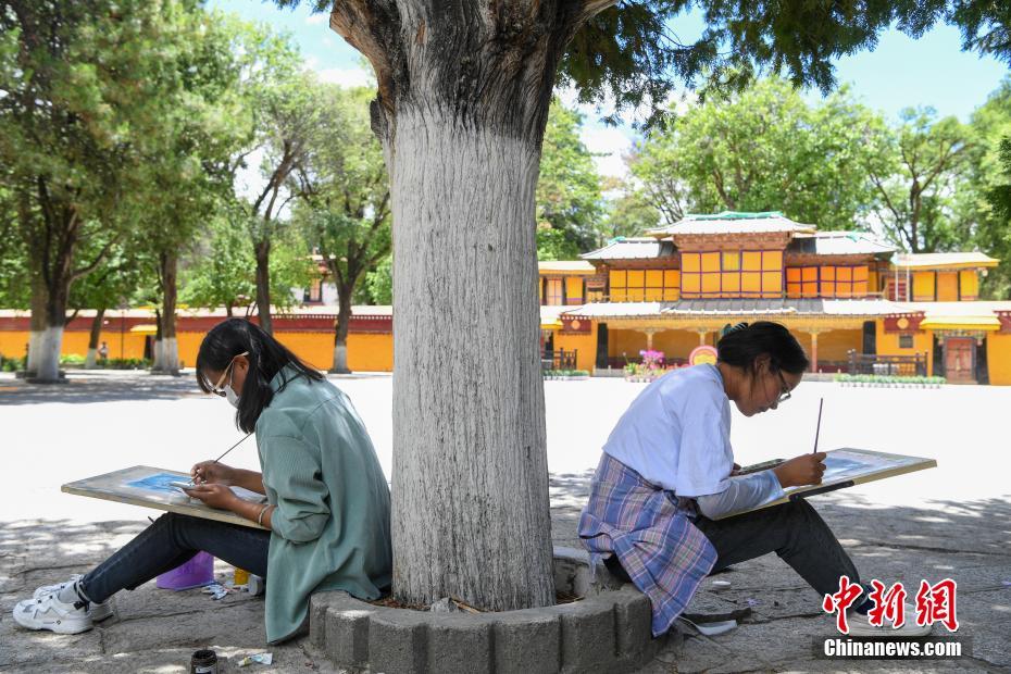圖為西藏大學(xué)建筑系學(xué)生正在手繪羅布林卡內(nèi)的建筑。 中新社記者 貢嘎來(lái)松 攝