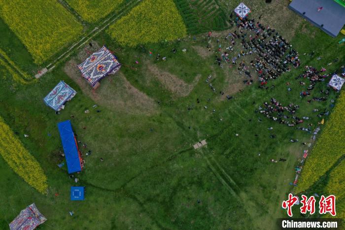 圖為西藏自治區(qū)拉薩市墨竹工卡縣小油菜花文化旅游節(jié)現(xiàn)場。(無人機拍照)貢嘎來松 攝