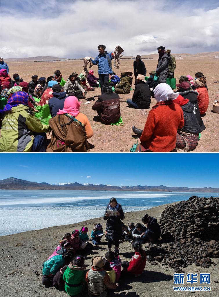 這是一張拼版照片:上圖為瑪曲鄉(xiāng)黨委書記朗卡江村(中)向參加活動的村民講解如何區(qū)分可回收垃圾與不可回收垃圾(2019年5月28日攝,新華社記者周錦帥攝);下圖為在海拔約5000米的西藏山南市浪卡子縣堆瓦村,駐村工作隊員貢曲(中)和次仁倉決(右一)給放假的孩子補(bǔ)習(xí)功課(2017年2月9日攝,新華社記者普布扎西攝)。新華社發(fā)