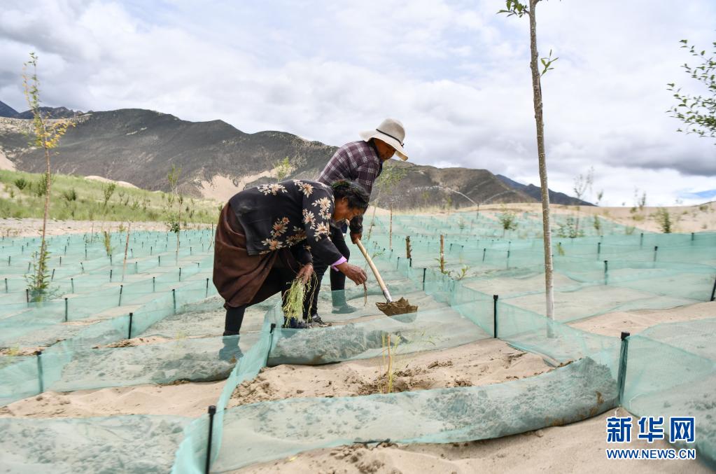 在山南市全國防沙治沙綜合示范區(qū),當?shù)厝罕娫谏车厣显苑N樹苗(7月20日攝)。新華社記者 晉美多吉 攝