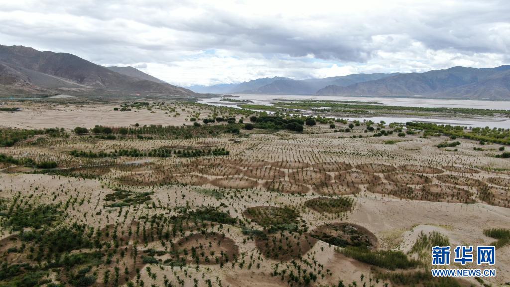 雅魯藏布江山南段沙丘上的人工林(7月20日攝,無人機照片)。新華社記者 晉美多吉 攝