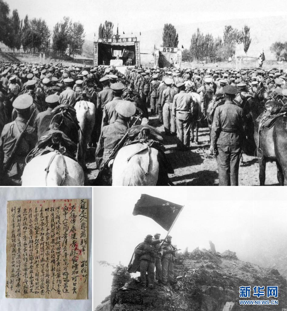 這是一張拼版照片,上圖為:1950年8月1日,獨(dú)立騎兵師一團(tuán)在新疆于田縣普魯村召開進(jìn)藏誓師大會(huì)(資料照片,進(jìn)藏英雄先遣連紀(jì)念館供圖);左下圖為:先遣連烈士陳忠義的家書(受訪者供圖);右下圖為:1951年,阿里和平解放(資料照片,進(jìn)藏英雄先遣連紀(jì)念館供圖)。新華社發(fā)