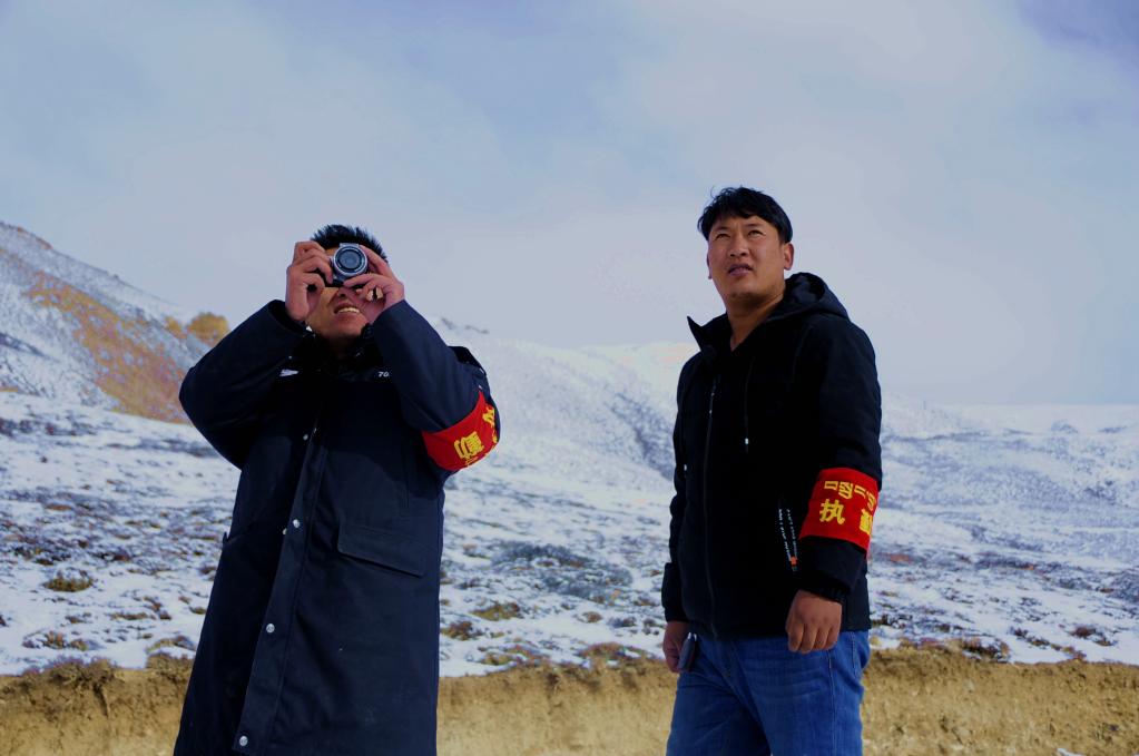 楚魯松杰鄉(xiāng)干部群眾在牧場例行巡邏(2019年1月8日攝)。 新華社記者陳尚才 攝
