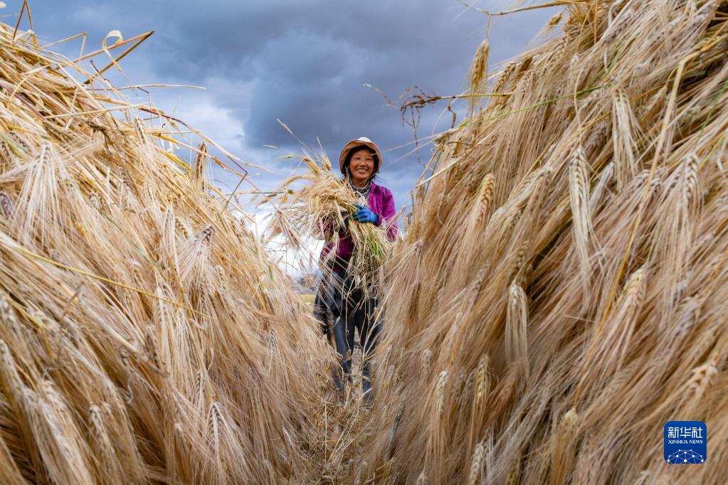 當日,西藏那曲市尼瑪縣文部鄉(xiāng)文部南村村民開鐮收割農(nóng)田里的青稞。文部鄉(xiāng)文部南村位于當惹雍措湖畔,海拔4645米,這里的村民以“薩馬卓”(半農(nóng)半牧之意)為主,在藏北高原獨具特色。