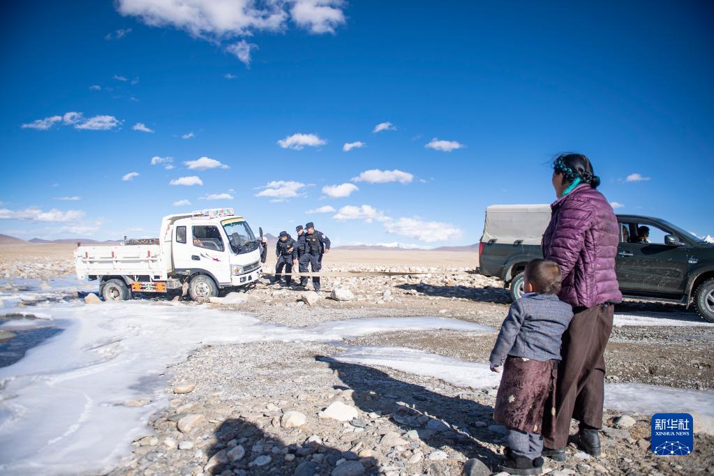 普瑪江塘邊境派出所的移民管理警察幫助牧民旦增多杰的家人離開(kāi)困在冰河里的小貨車(chē)(11月20日攝)。新華社記者 孫瑞博 攝