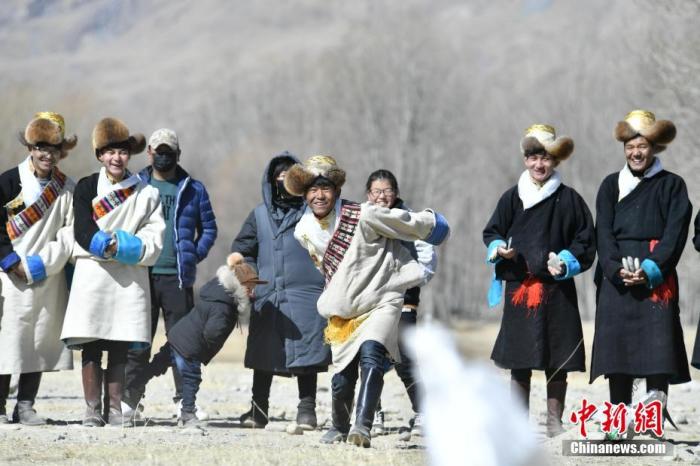 資料圖為西藏拉薩市曲水縣民眾新年期間表演藏族民間娛樂(lè)項(xiàng)目“打牛角”。中新社記者 貢嘎來(lái)松 攝