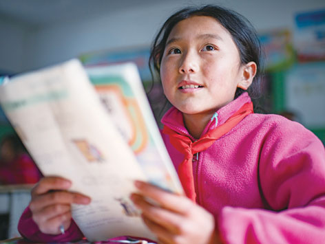 陳塘鎮(zhèn)小學(xué)三年級學(xué)生旺姆在讀課文(11月24日攝)。 普布扎西、格桑邊覺、孫瑞博攝