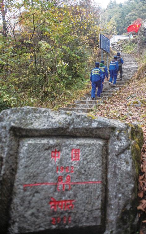 夏爾巴巡邊員們沿著中尼邊境巡邏時(shí)經(jīng)過界碑(11月24日攝)。普布扎西、格桑邊覺、孫瑞博攝