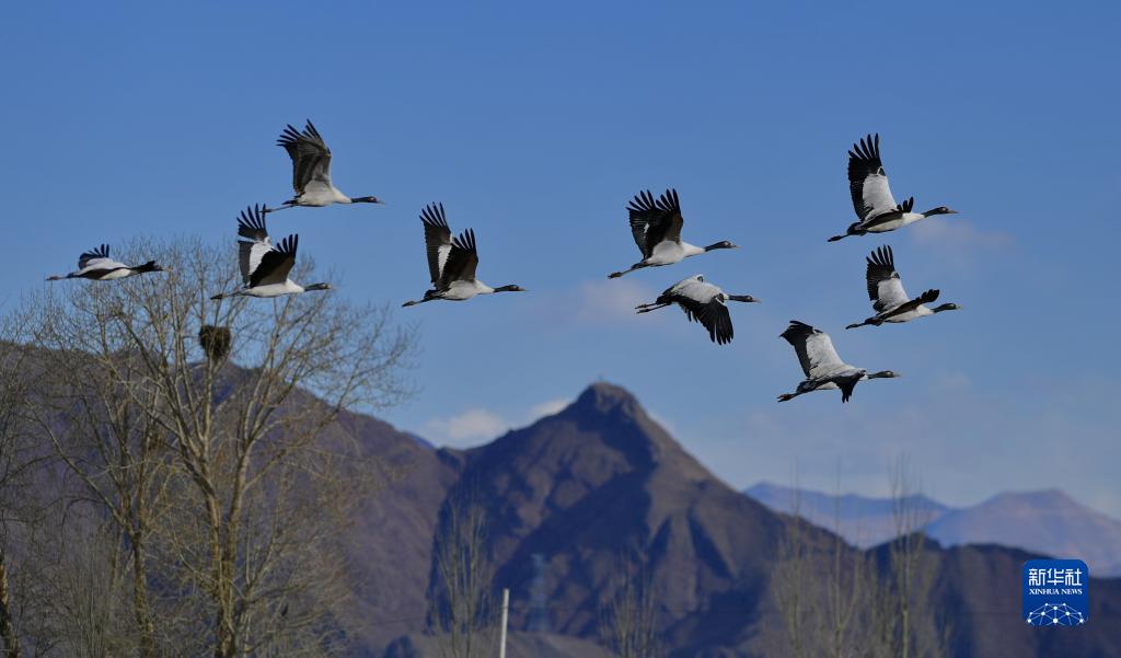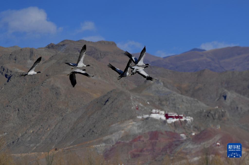 黑頸鶴在拉薩市林周縣上空飛翔(1月9日攝)。新華社記者 張汝鋒 攝