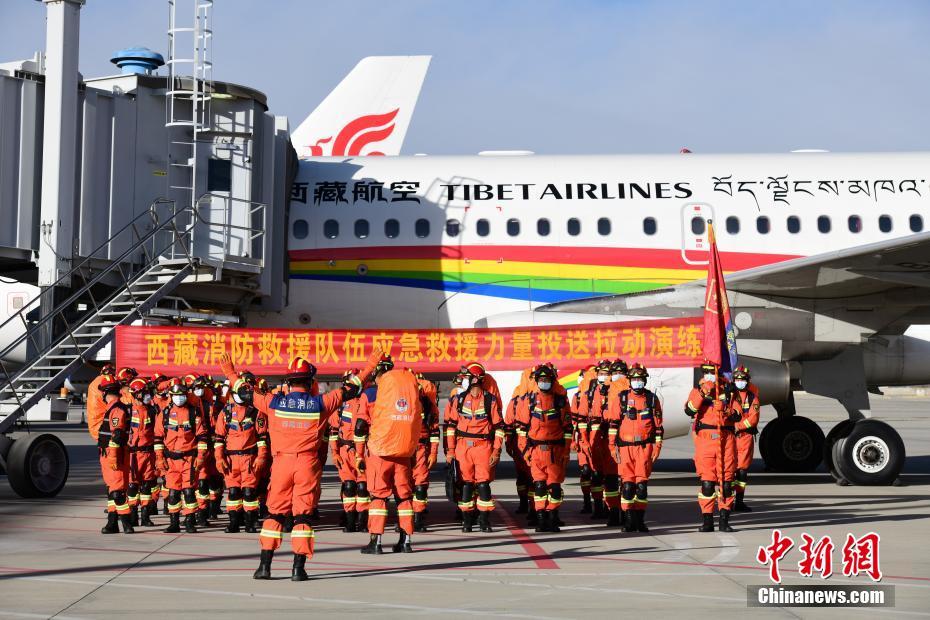 1月20日,西藏自治區(qū)消防總隊(duì)在拉薩貢嘎國(guó)際機(jī)場(chǎng)開(kāi)展2022年跨區(qū)域地震災(zāi)害應(yīng)急救援力量投送拉動(dòng)演練。據(jù)悉,演練投送的裝備主要為個(gè)人72小時(shí)保障物資、通信器材和輕便型的相關(guān)救援器材。 中新社記者 貢嘎來(lái)松 攝