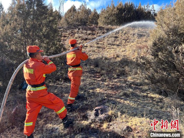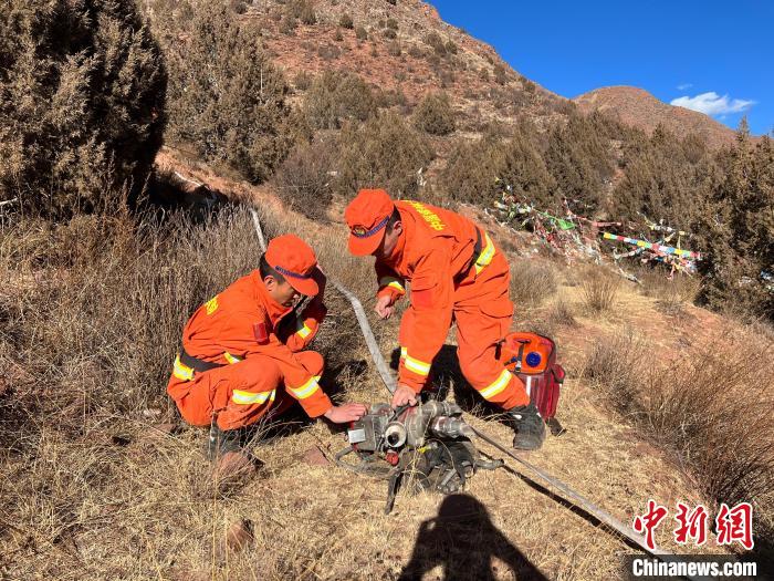 圖為消防指戰(zhàn)員架設(shè)水源地。江達縣森林消防中隊貢覺駐防分隊 供圖
