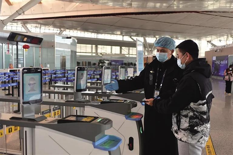 安檢人員協(xié)助旅客完成預(yù)安檢。