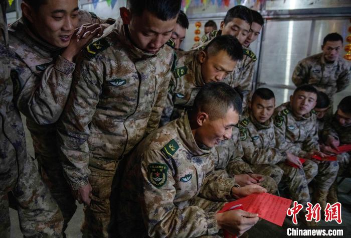 聯(lián)歡的尾聲指導(dǎo)員夏邦國拿著最后的彩袋走到臺前,把晚會推向高潮,“兄弟們,這還有一大袋紅包,里面裝著的可是最珍貴的祝?!薄9俦鴤冇贸槊ず械男问讲痖_新年的“紅包”。中士趙路寬抽到一個最鼓的,打開是滿滿的糖果;下士吳兵拆開的是一個帶有小機關(guān)的新年賀卡;下士鄧云川拆到一封遠(yuǎn)方的匿名信,“雖不曾相見與相識,但知道是你們在默默堅守付出,守衛(wèi)著祖國的雪域邊防”。伴隨著他磕絆的普通話,連隊官兵漸漸安靜下來。“邊關(guān)有我,請祖國和人民放心”,簡易投影的大屏上開始播放著官兵們一年多來頂風(fēng)冒雪,戰(zhàn)天斗地的光影片段,在這大山里的多少的苦累酸甜,都已經(jīng)鐫刻在茫茫雪域。