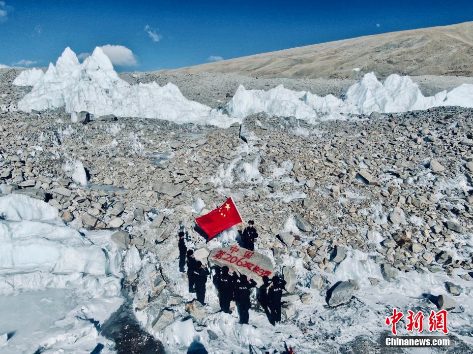 圖為普瑪江塘邊境派出所移民管理警察在邊境冰川巡邏期間面向警旗莊嚴(yán)宣誓。 索朗次旺 攝