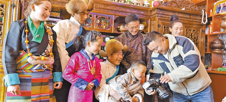 “來,大家看這里!”“咔嚓”一聲,相機(jī)定格了鏡頭前旦巴一家四口的笑容。在藏歷新年來臨之際,墨竹工卡縣甲瑪鄉(xiāng)赤康村村民身穿節(jié)日盛裝,等待著專業(yè)攝影師免費(fèi)拍攝、現(xiàn)場(chǎng)打印全家福照片,留住與家人歡聚一堂的溫馨時(shí)刻。
