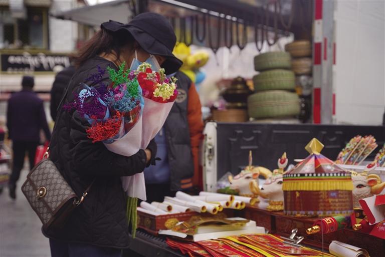 千門萬戶曈曈日,總把新桃換舊符。隨著各民族交往交流交融,藏文對聯(lián)也逐漸成為藏歷新年年貨市場中不可缺少的“成員”,寄托了人們對來年美好生活的殷切期盼。走進(jìn)沖賽康市場,記者看到很多攤位都擺放著各式各樣紅色藏式對聯(lián),內(nèi)容主要蘊含平安、健康、長壽等吉祥的寓意,不時還有市民前來詢價選購。此外,每年藏歷新年前,不少書法家還會將滿載祝福的對聯(lián)寫好后送給市民,把濃濃的年味和對藏歷新年的祝福送到大家手中。