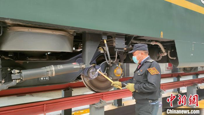 資料圖為嘎瑪達(dá)吉利用庫停時間對列車走形部進(jìn)行檢查。青藏集團公司供圖