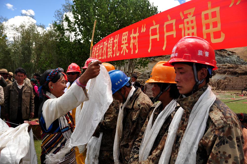 西藏日喀則市江孜縣扎果村戶戶通電工程竣工投運(yùn),農(nóng)牧民群眾向工程建設(shè)者們獻(xiàn)上哈達(dá)。圖片由國(guó)網(wǎng)西藏電力提供