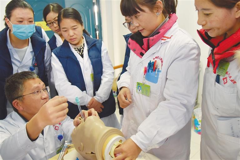 圖為西藏自治區(qū)那曲市人民醫(yī)院援藏專家手把手向醫(yī)務(wù)人員傳授“氣管插管術(shù)”動作要領(lǐng)。記者 次仁片多 攝
