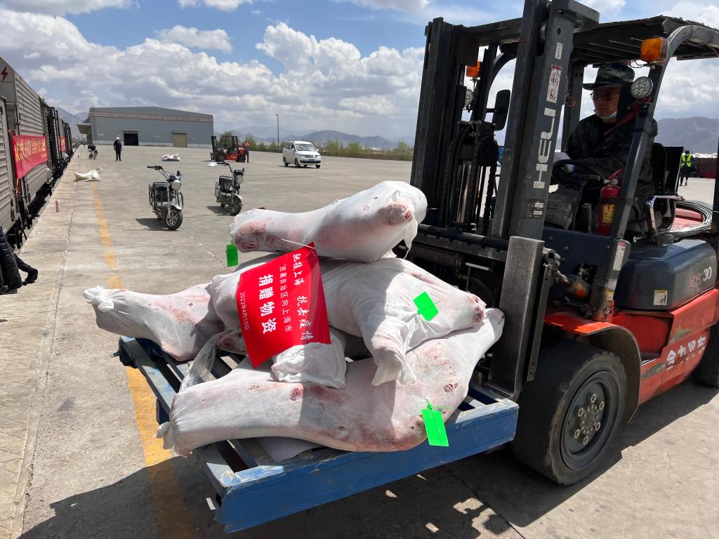 4月10日,鐵路工作人員在西藏日喀則站裝運牦牛肉。(中國鐵路青藏集團有限公司拉薩車務(wù)段供圖)