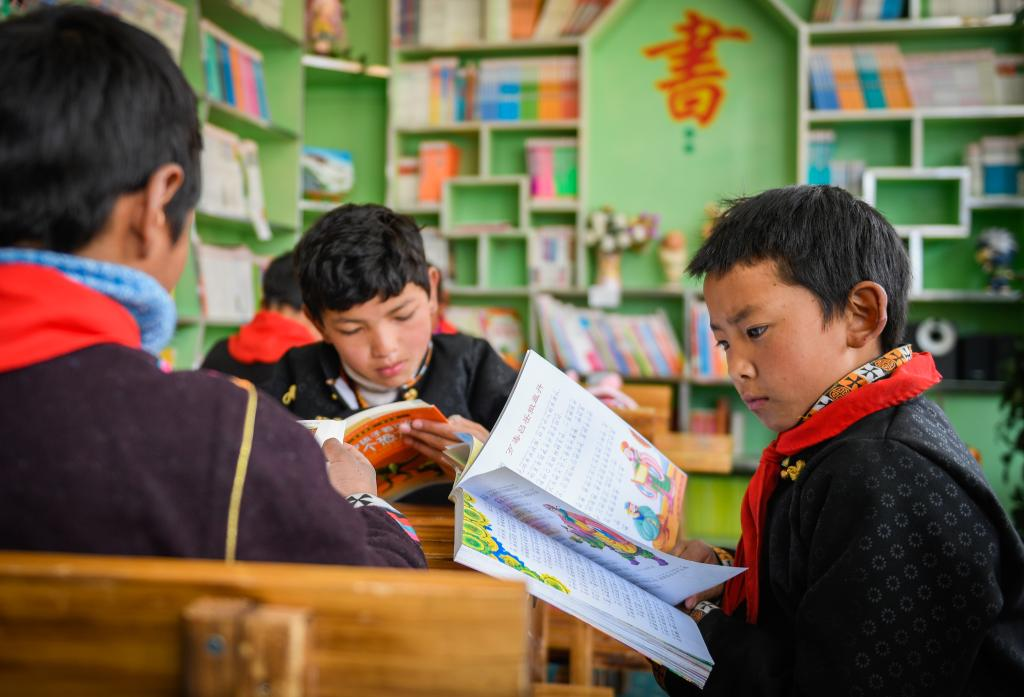 西藏林芝市工布江達縣仲莎鄉(xiāng)中心小學(xué)低年級學(xué)生在校圖書室內(nèi)閱覽書籍(2018年4月攝)。新華社發(fā)