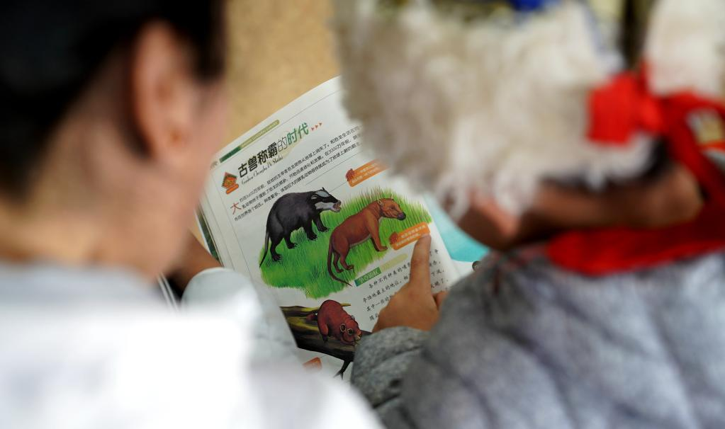 西藏自治區(qū)圖書館兒童閱覽室內(nèi),家長和孩子一起閱讀繪本(2018年2月攝)。新華社記者晉美多吉攝