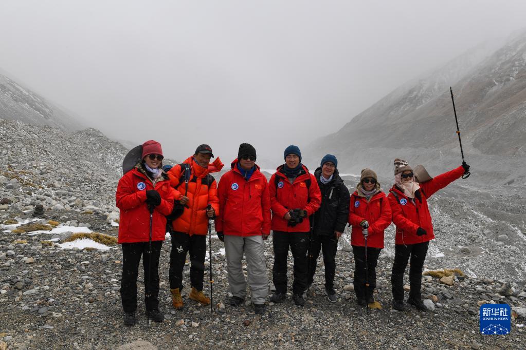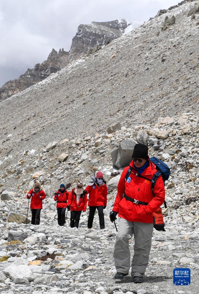 朱彤院士(右一)率領(lǐng)隊伍在絨布冰川附近進行拉練。(2022年5月1日攝)新華社記者姜帆 攝