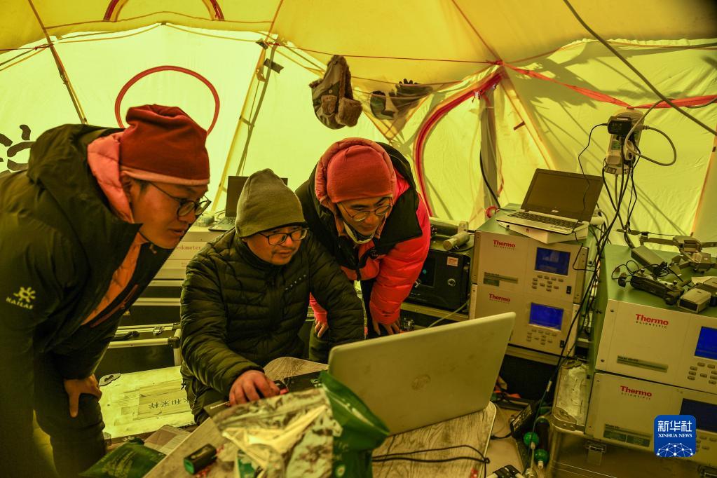 5月3日,在珠峰登山大本營,科研人員查看大氣數(shù)據(jù)。新華社記者 姜帆 攝