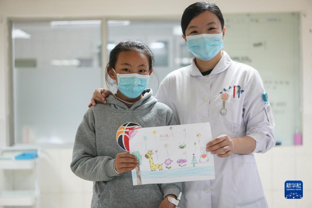 小患者次仁旺姆將自己的畫(huà)送給護(hù)士湯燕,祝她護(hù)士節(jié)快樂(lè)(5月12日攝)。