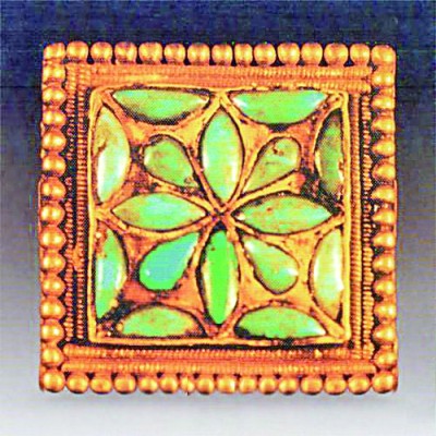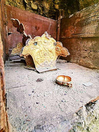 烏蘭泉溝吐蕃壁畫(huà)墓暗格木箱內(nèi)鎏金王冠和金杯。資料圖片