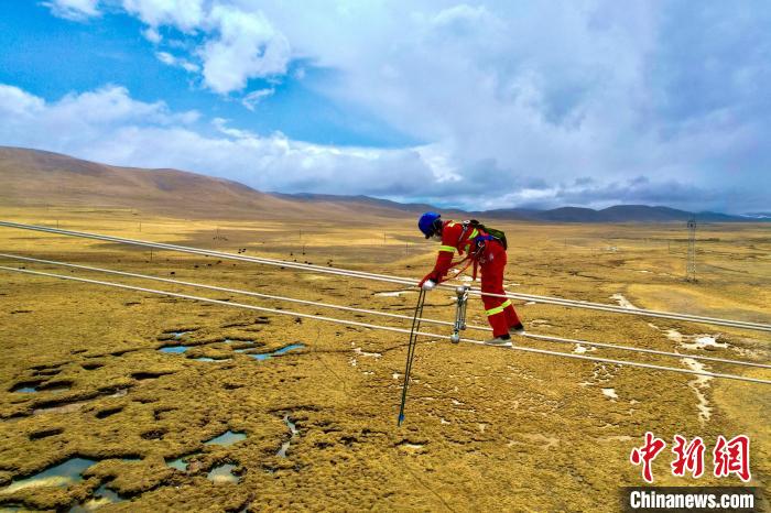 青藏聯(lián)網(wǎng)工程年檢工作人員正在進行走線?!¢Z昱翰 攝