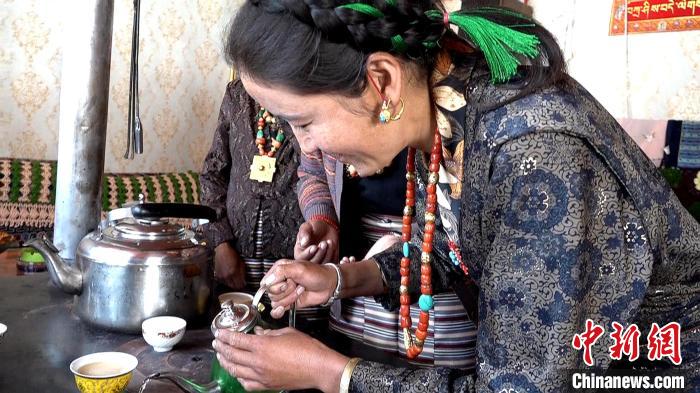 圖為小妹米瑪給來訪客人品嘗底雅鄉(xiāng)特色杏子酒。貢桑拉姆 攝